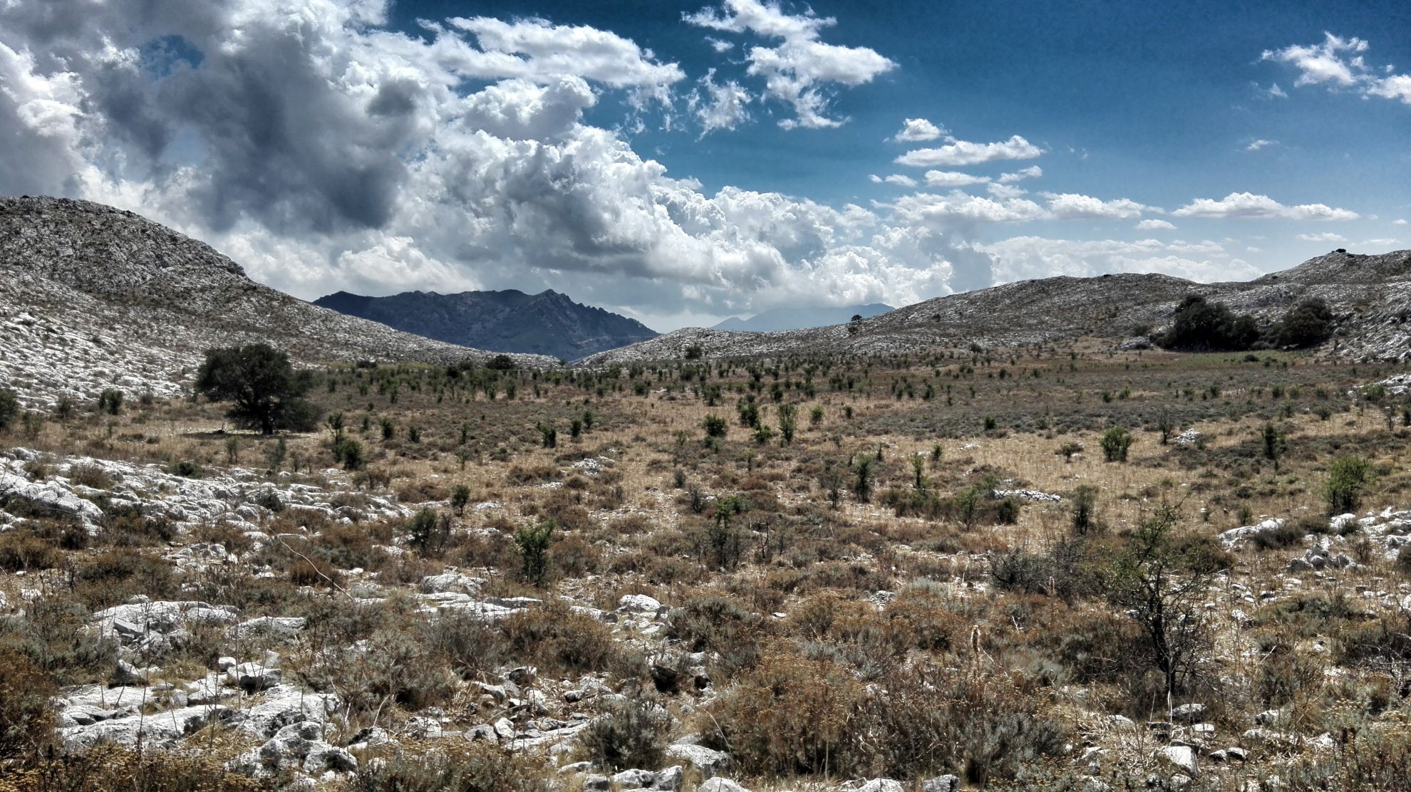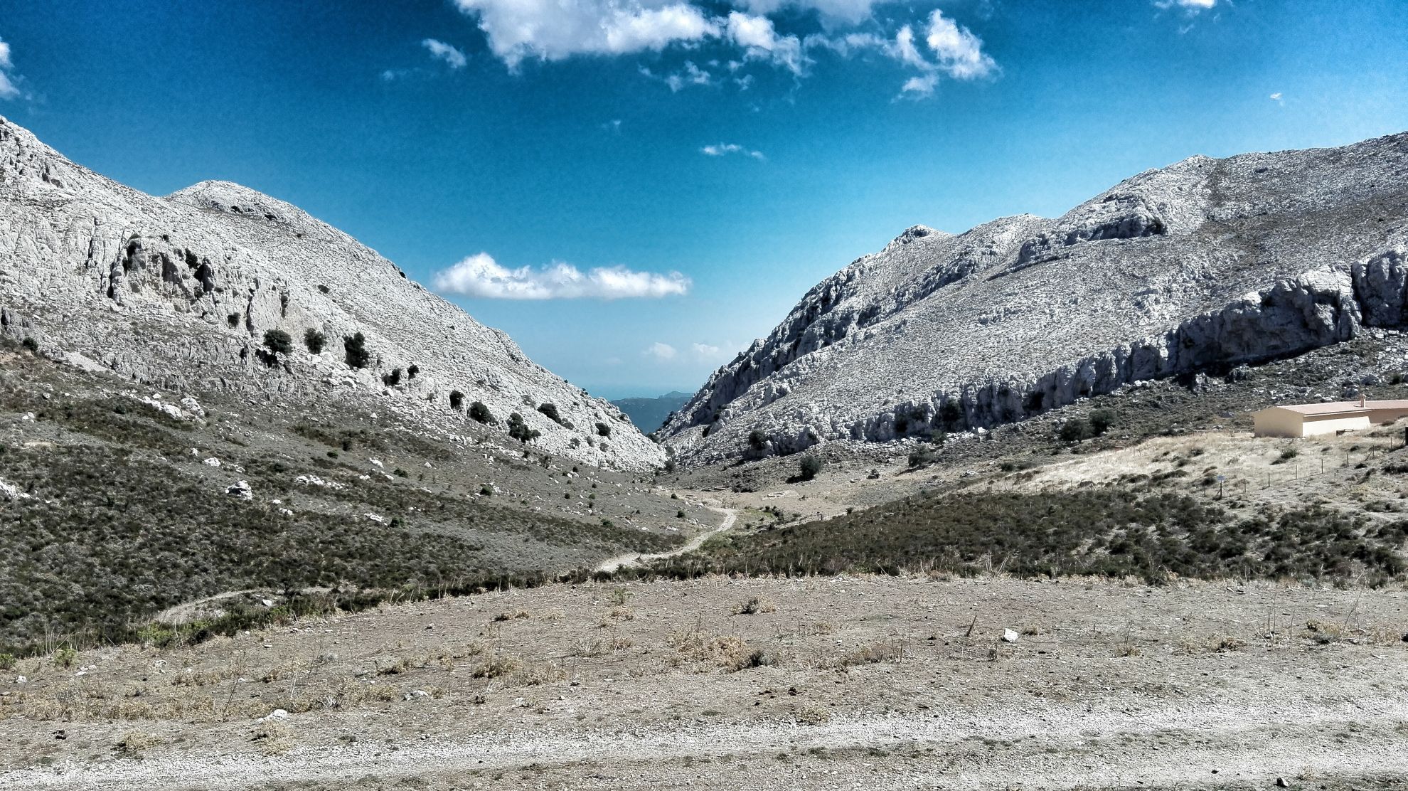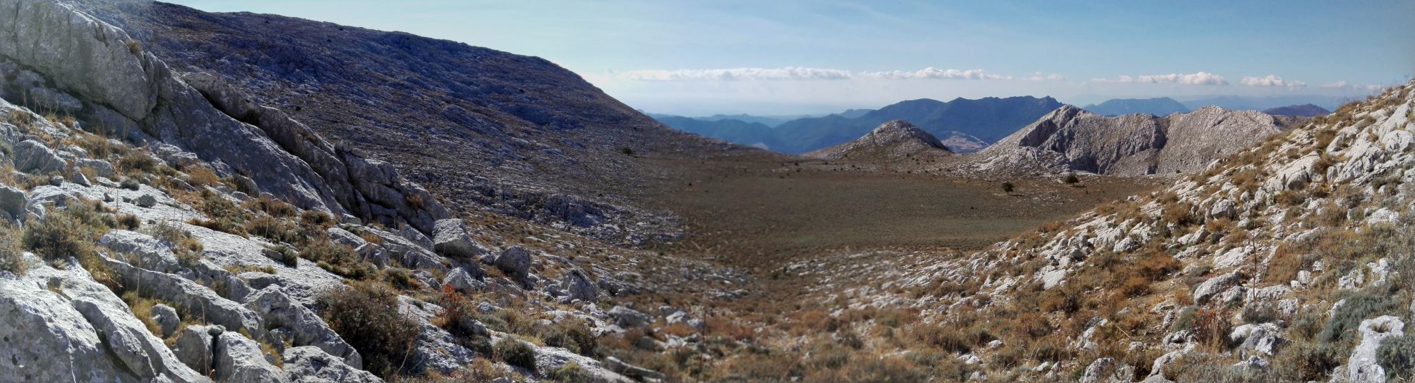 C’è molta strada da fare e dopo le foto di rito affrontiamo la discesa lungo i canaloni scavati dell’acqua sino ad arrivare nell’altipiano Ena Cupetti che attraverseremo da nord verso sud-ovest e mantenendo come obiettivo due perastri, unici alberi in tutta la valle completamente ricoperta da cespugli di elicriso. Da qui in poi non troveremo più nulla di segnato od alcun sentiero visibile.